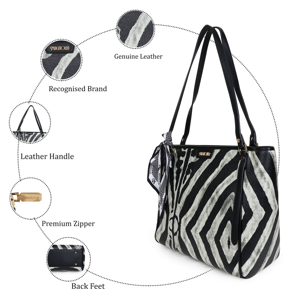 The Marcella Tote Bag exudes elegance with its stunning off-white and black abstract print vegan leather, making it a stylish statement piece. Enhanced by a self-designed ribbon scarf that adds flair and value, this tote bag is adorned with base studs for stability and protection, ensuring durability over time. Secured with a zipper closure, the Marcella Tote Bag offers practicality and security for your belongings. Its long shoulder handles provide comfort and ease of carrying, ideal for daily use or special occasions. Inside, the tote bag is lined with polyester for a sleek finish and includes organizational features such as pockets for storing essentials. This combination of aesthetic appeal and functionality makes the Marcella Tote Bag a versatile accessory that complements both casual and formal outfits.