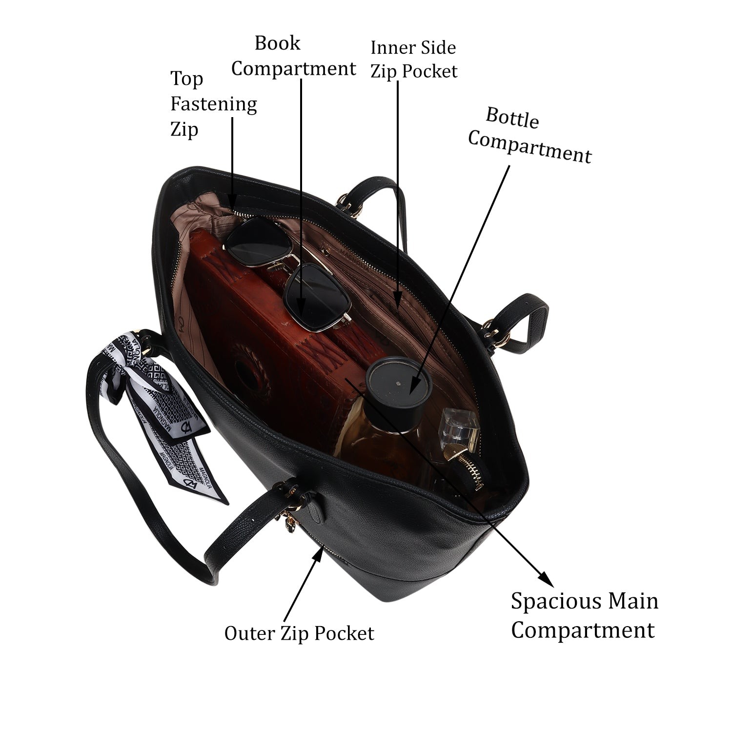 The Bruna Medium Tote Bag is a stunning accessory crafted from sleek black vegan leather, featuring adjustable shoulder handles that offer both style and practicality. Adding a charming touch, it